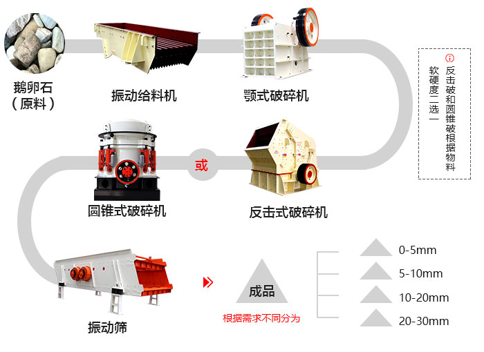 天然鵝卵石經(jīng)過料倉,由振動給料機進行均勻、連續(xù)喂料,送到顎式破碎機進行初級破碎,經(jīng)過初級破碎后的鵝卵石以及由振動給料機篩分的細(xì)小鵝卵石在皮帶輸送機的作用下被輸送到中轉(zhuǎn)料堆。