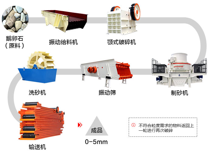 大塊的鵝卵石需要粗碎后才可以進入細(xì)碎機進行細(xì)碎,細(xì)碎粒度合適的鵝卵石被送入制砂機進行細(xì)碎加工,制砂后的鵝卵石由圓振篩進行篩分,較大粒級鵝卵石返送至制砂機再次破碎,符合需求的則由皮帶機送至儲料堆貯存制成鵝卵石砂子的物料被送入洗砂機清洗,清洗后,作為最終產(chǎn)品的一部分,由皮帶機傳送至儲料堆進行包裝
