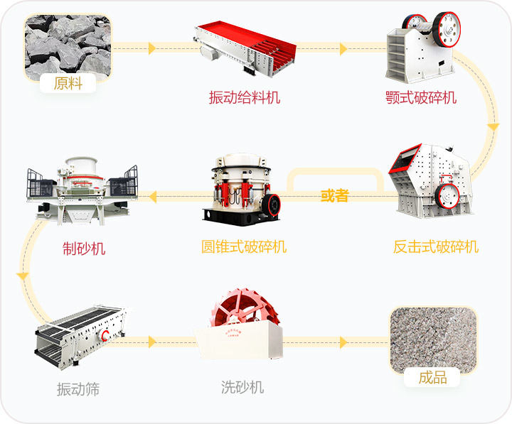 設備配置:顎式破碎機、反擊式破碎機或液壓圓錐破,制砂機洗砂機,圓振動篩等設備